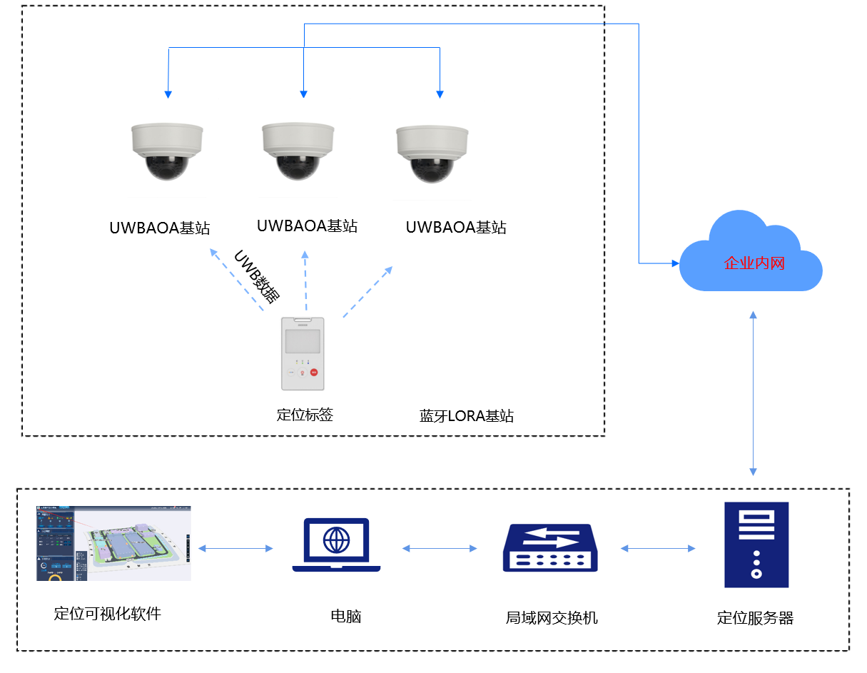 该系统基于UWBAOA基站的方位角、俯仰角、标签的TOF值的算法结合卡尔曼滤波算法结合平台端的路径约束、围栏约束等算法;实现高精度、大容量的人员物资精准定位。该系统具有精度高、可靠性高、大容量拓展性强、部署灵活性。