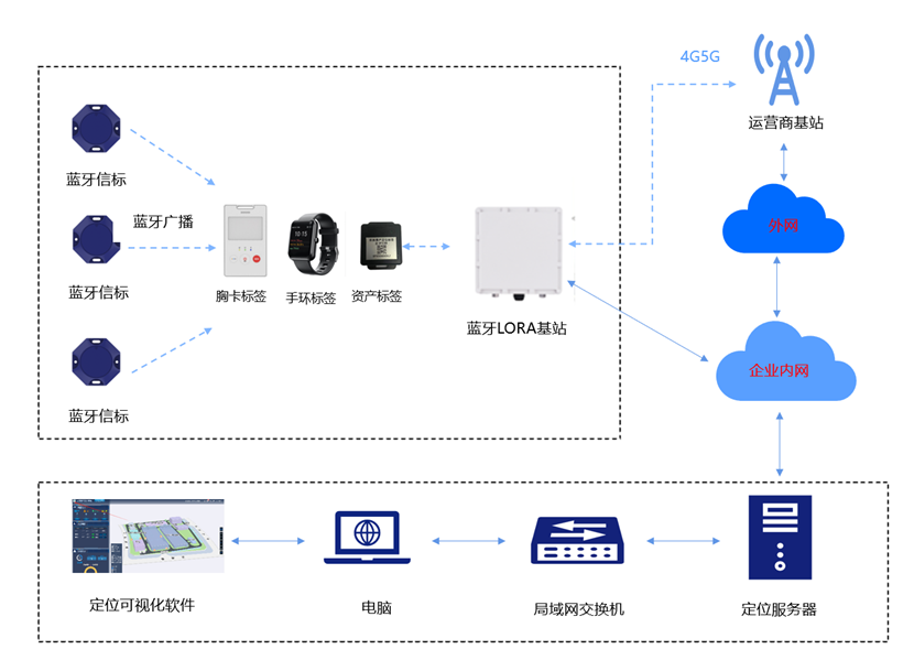 - 蓝牙LORA基站(通信):基于510M和2.4G的双模物联网基站,室外支持500m覆盖半径,室内支持蓝牙5.0通信,与定位标签(如胸牌)通信,通过有线网络或4G网络将信息回传至服务器;