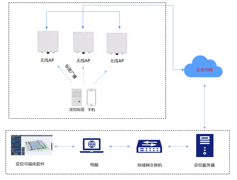 - 在定位区域将定位标签/手机对外广播WiFi信号,AP探针扫描到定位标签/手机的信号通过AP、交换机有线网络回传到定位服务器。