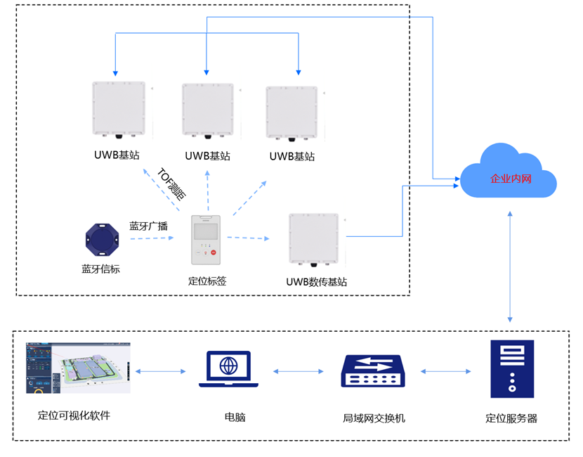 定位原理:UWB基站和UWB标签相互测距并且把UWB标签的测距数据通过UWB基站的有线网络回传到定位服务器;UWB标签在蓝牙信标区域通过扫描蓝牙信标并且把数据通过UWB数传基站的有线网络 回传到定位服务器